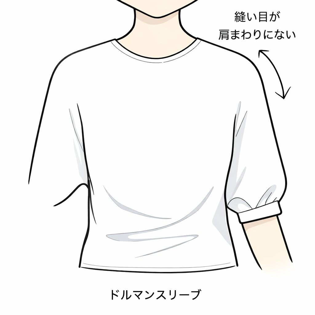 - なで肩の場合:肩の傾斜がなだらか。生地が下に落ちやすく、袖が余りやすい傾向にあります。