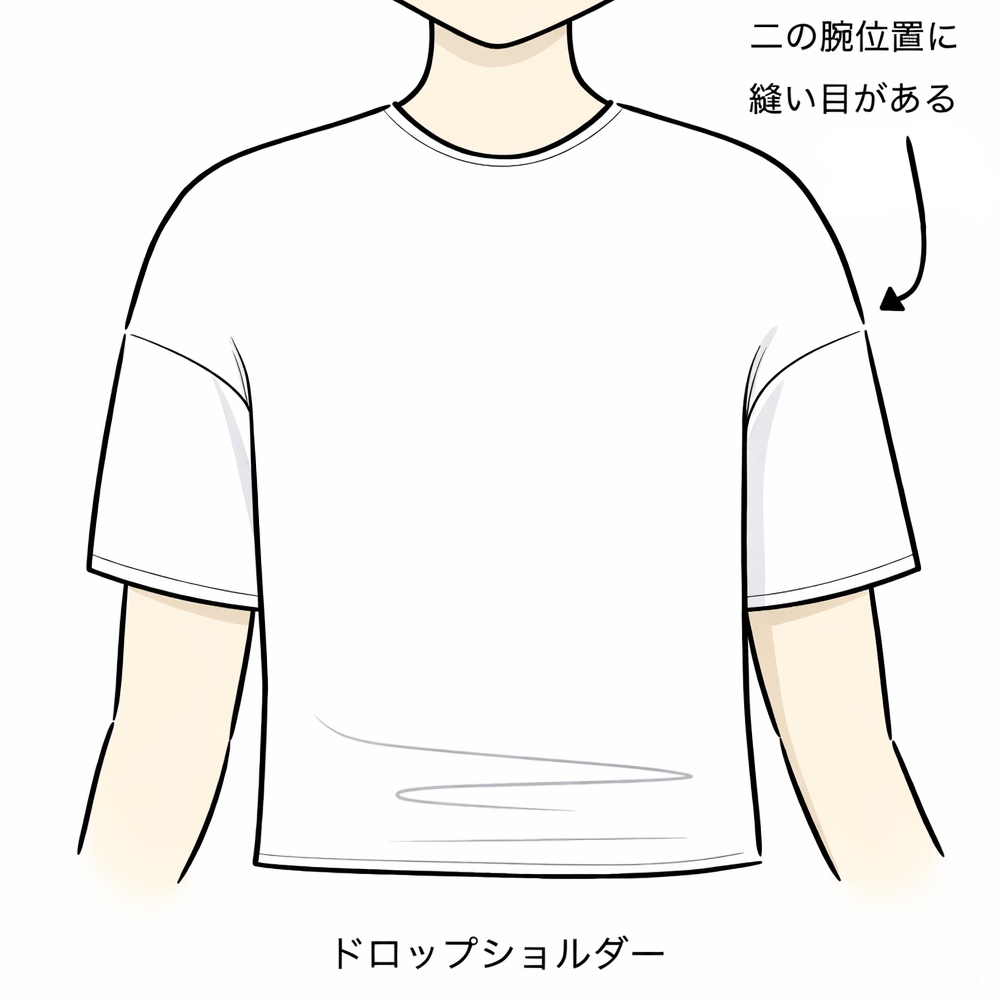 肩線が本来の肩位置よりも落ちているデザインです。少しゆったりしたトップスによく見られます。