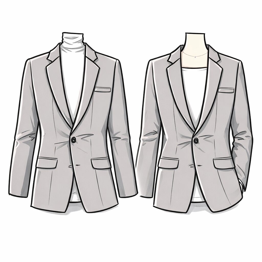 - 左(ハイネックなど):首元に高さが出ることで、落ち着いた「きちんと感」のある印象に。